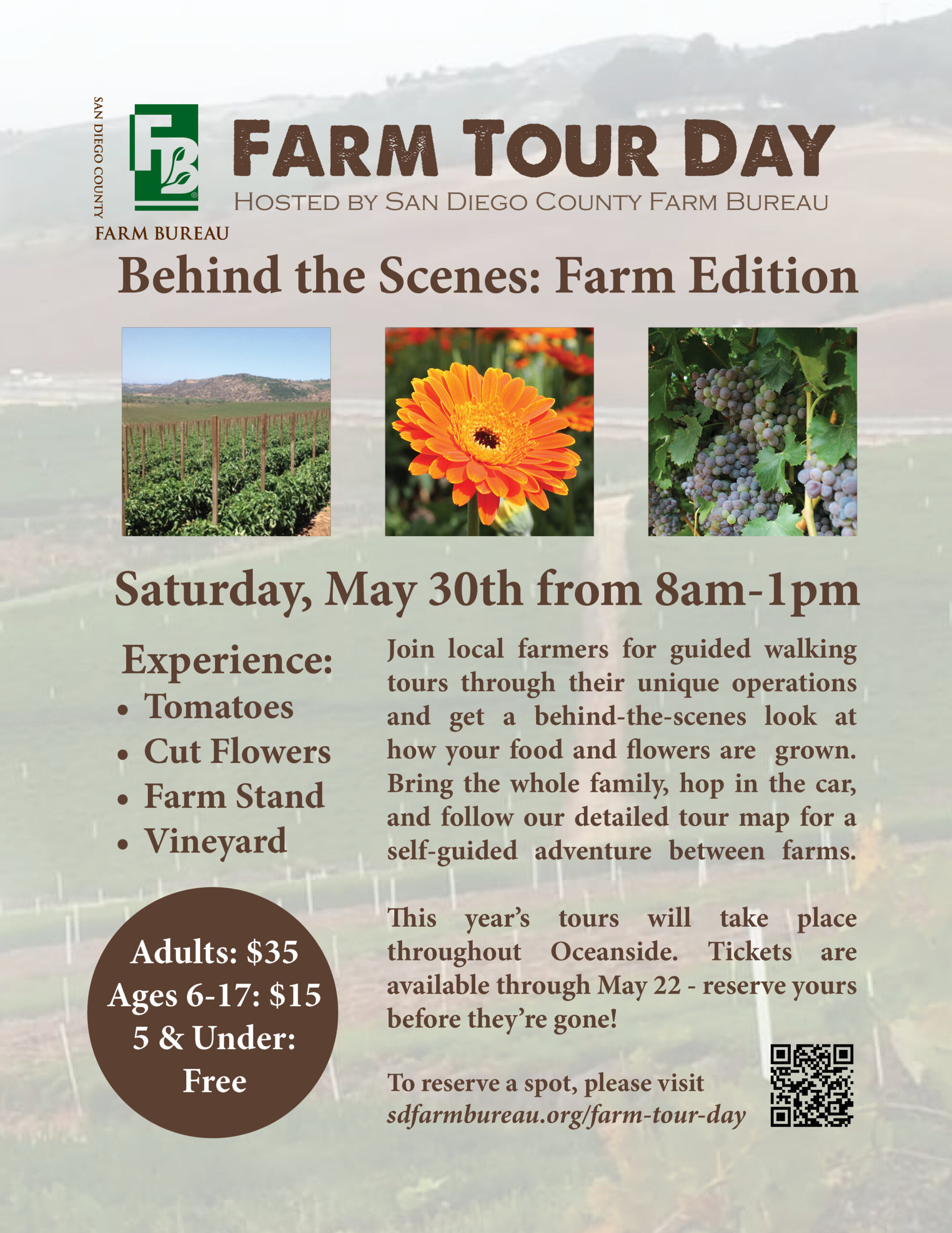 Tours this year will be located in Oceanside. Farms will feature tomatoes, cut flowers, farm stand, wine grapes and more!